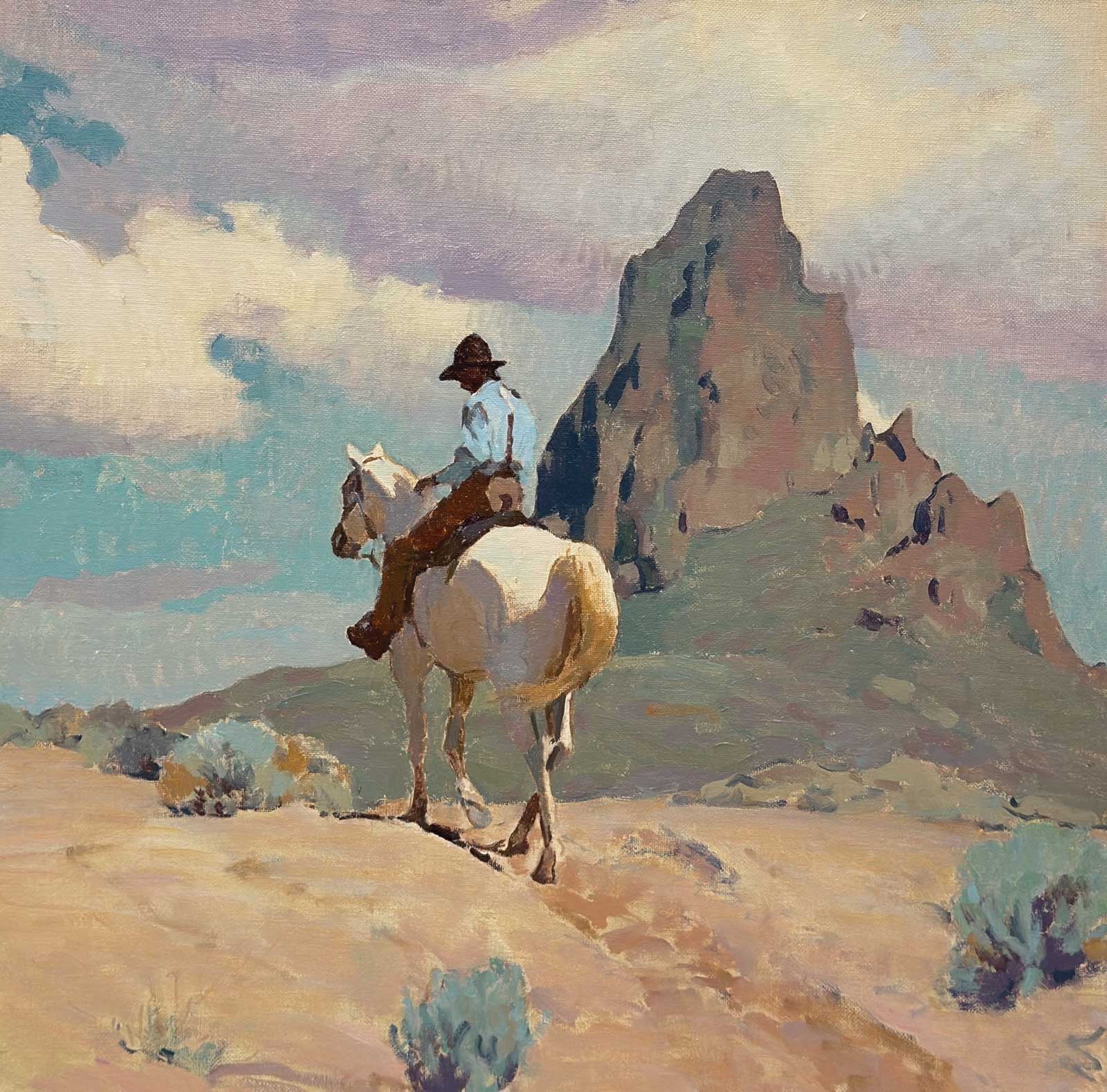 Dean will be offering his newest painting, Desert Passage, showing a horse and rider in front of a large rocky butte in the distance.