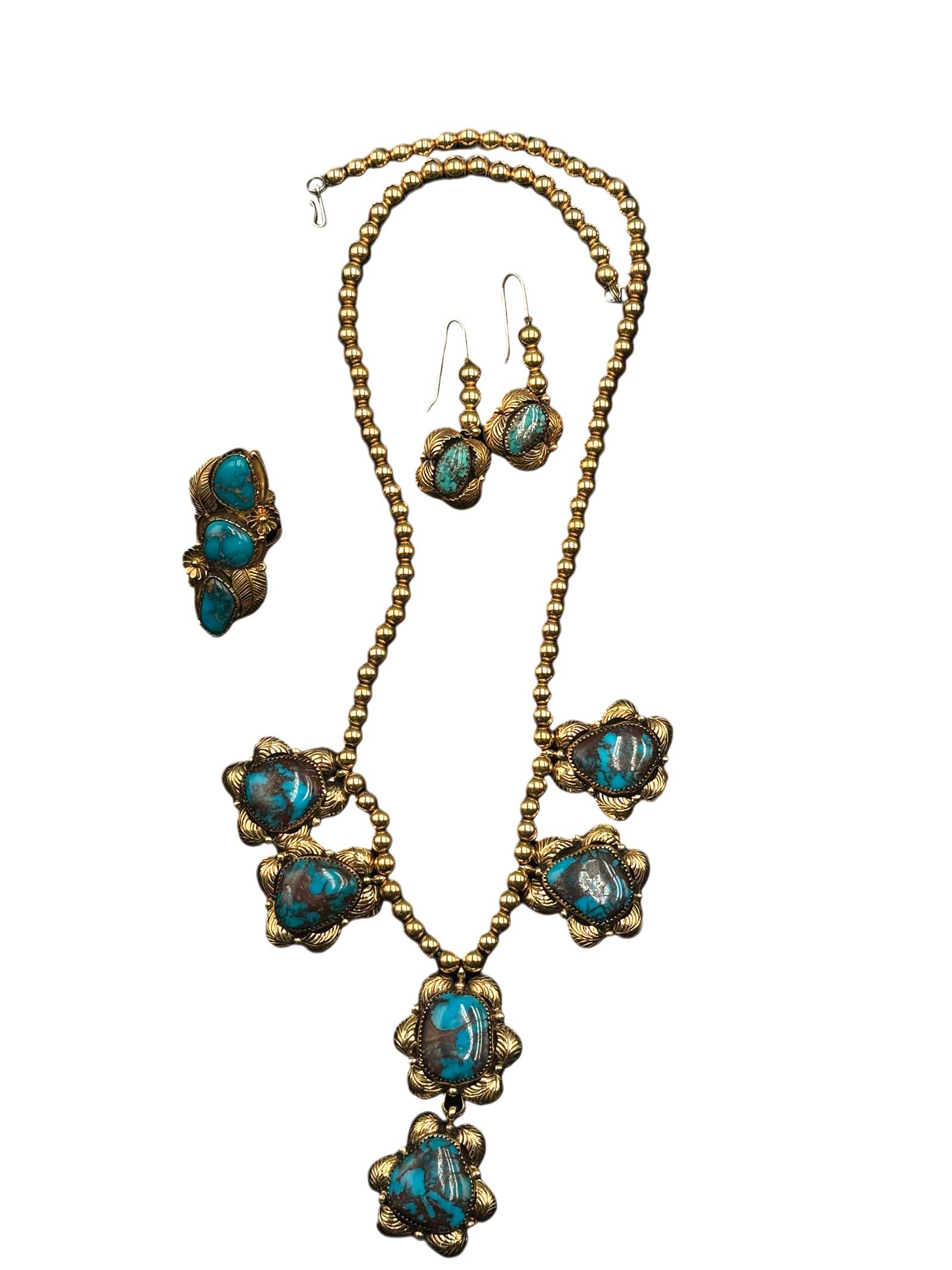 14K gold Bisbee necklace set, necklace, 25 in.; ring size, 10¼; earrings, ¾ x 1½ in. Estimate: $9/18,000