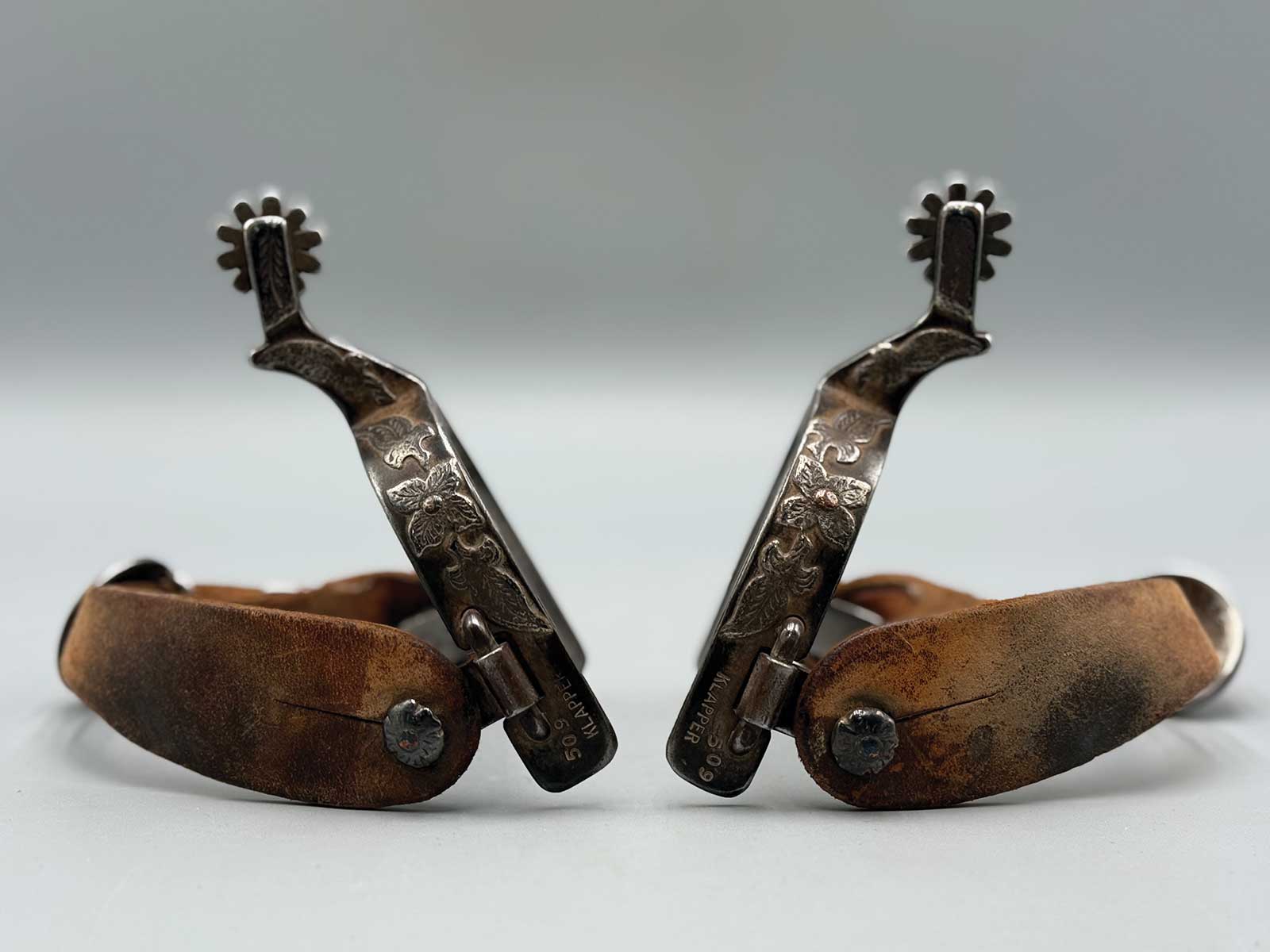 Billy Klapper (1939-2024), the artist’s personal spurs, ca. 1991, heel opening 3¼ in., shanks measure 17/8 in. Estimate: $7,500/15,000