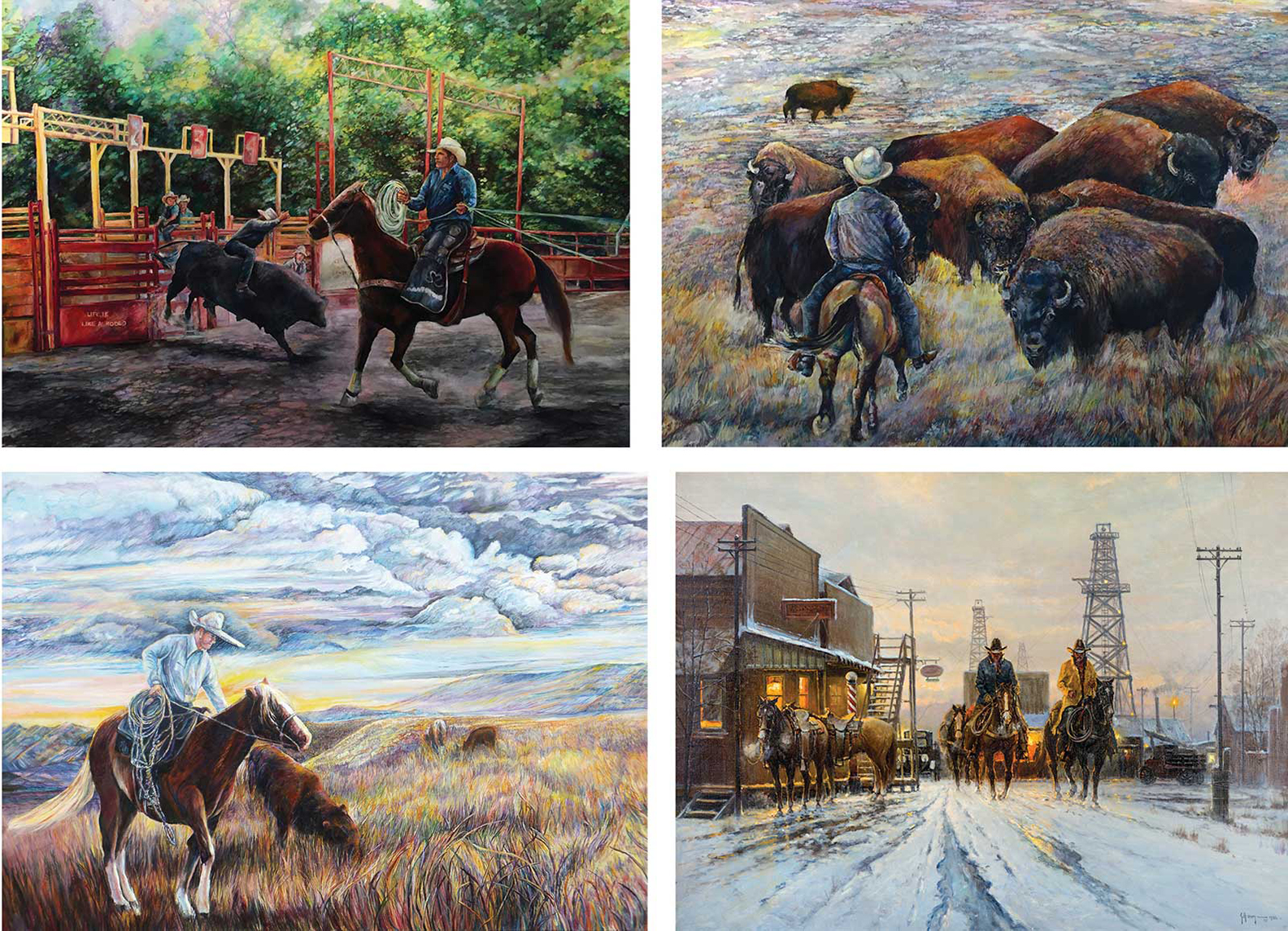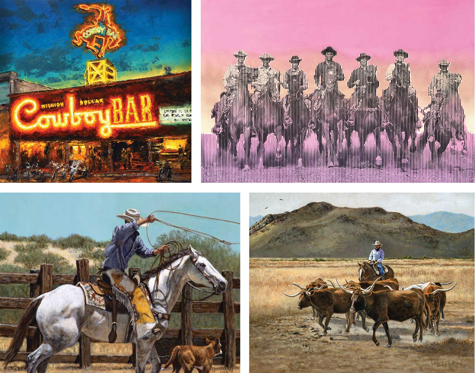 Top: Paulette Bensignor, Life Lessons, oil on canvas, 30 x 48 in.; Paulette Bensignor, Refusing to Move, oil on canvas, 24 x 30 in. Bottom: Paulette Bensignor, Rider Wearing Sombrero, oil on canvas, 30 x 40 in.; J Watson Fine Art, Rawhide and Roughnecks, oil on canvas, 36 x 48 in., by G. Harvey (1933-2017).