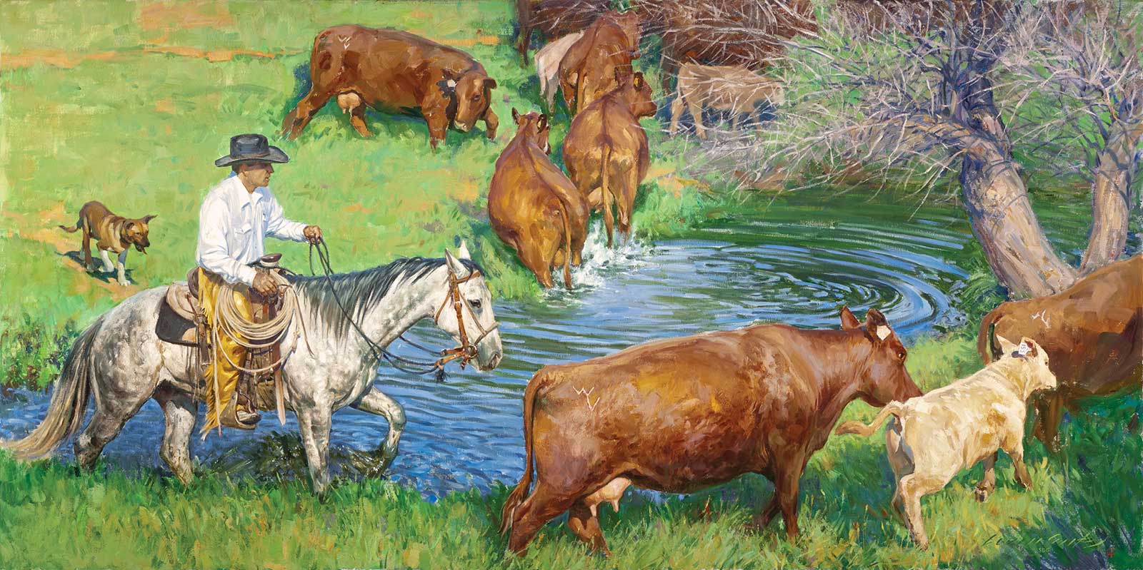 Loren Entz (1949-2022), Workin the Shallows, Nate Wald, Wald Ranch, Lodge Grass, MT, oil on canvas, 36 x 72 in. Consider the early days of cowboying in the rough-and-tumble Old West days, when cowboys were not the clean-cut heroes of a Tom Ryan painting, their heads bowed in prayer, a coarse word having never crossed their lips. In the early days, many of the people who worked cattle on horseback were those who felt rejected by modern society, or were doing everything they could to escape it. They were known to be criminals, outlaws, grifters and rejects. Many of them went West to ride hard trails for miserable pay in dangerous conditions.