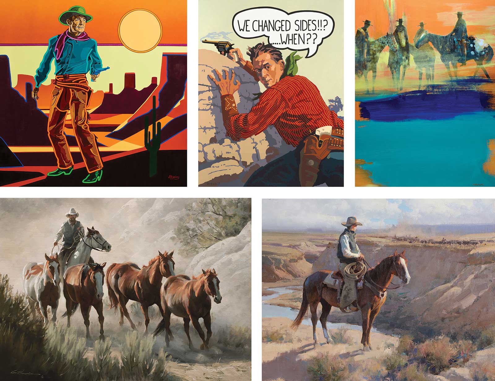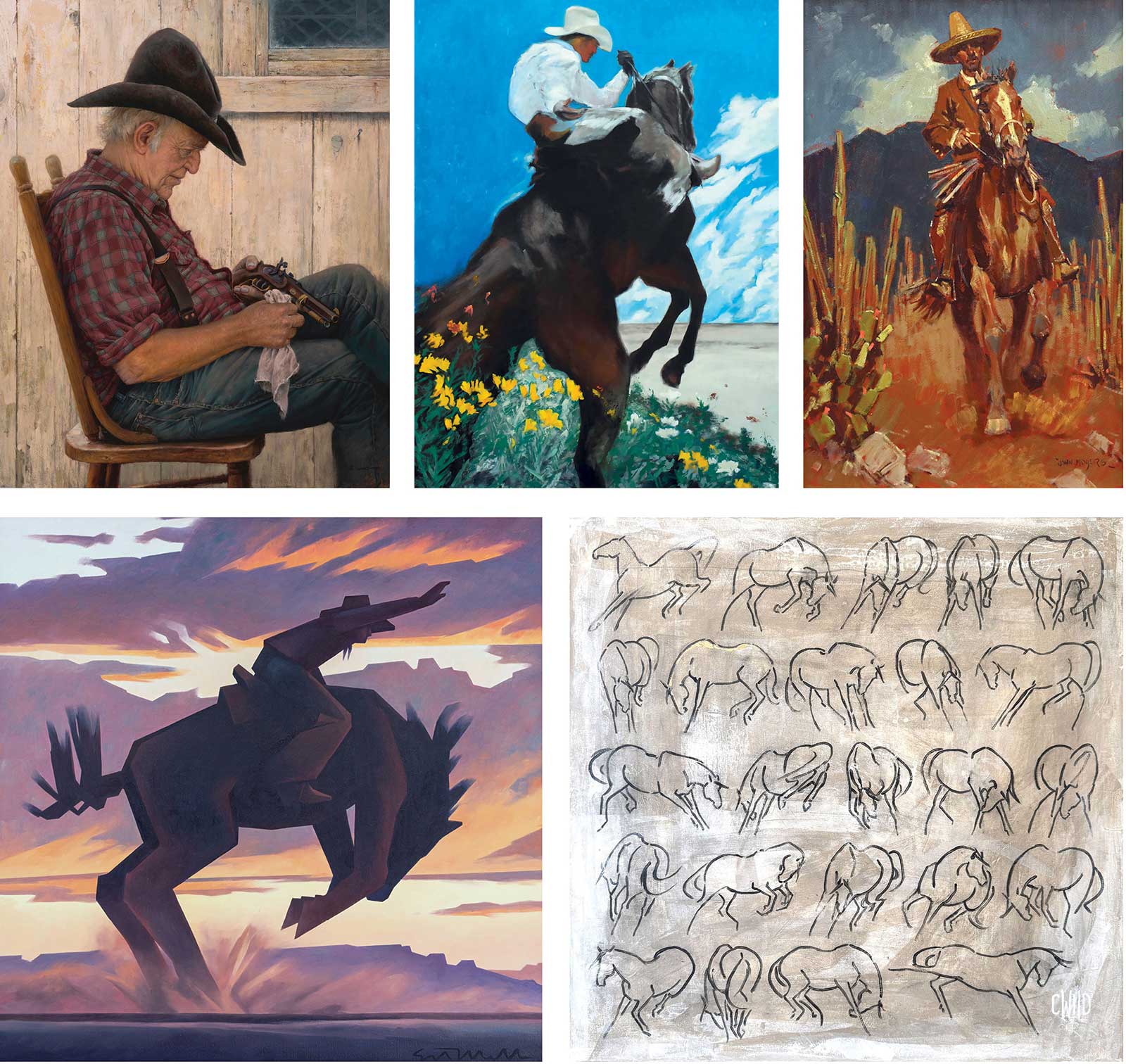Top: Altamira Fine Art, When the Primary Hideout Turns Secondary, oil on linen, 40 x 40 in., by Michael Blessing; Altamira Fine Art, We Changed Sides?, oil on canvas, 45 x 35 in., by Billy Schenck; Altamira Fine Art, Posse, acrylic on panel, 48 x 36 in., by Rocky Hawkins. Bottom: Legacy Gallery Santa Fe, Bunchin the Mares, oil, 22 x 30 in., by Tom Browning; Legacy Gallery Santa Fe, A Drive Along the Rim, oil on linen, 20 x 24 in., by Bill Anton.