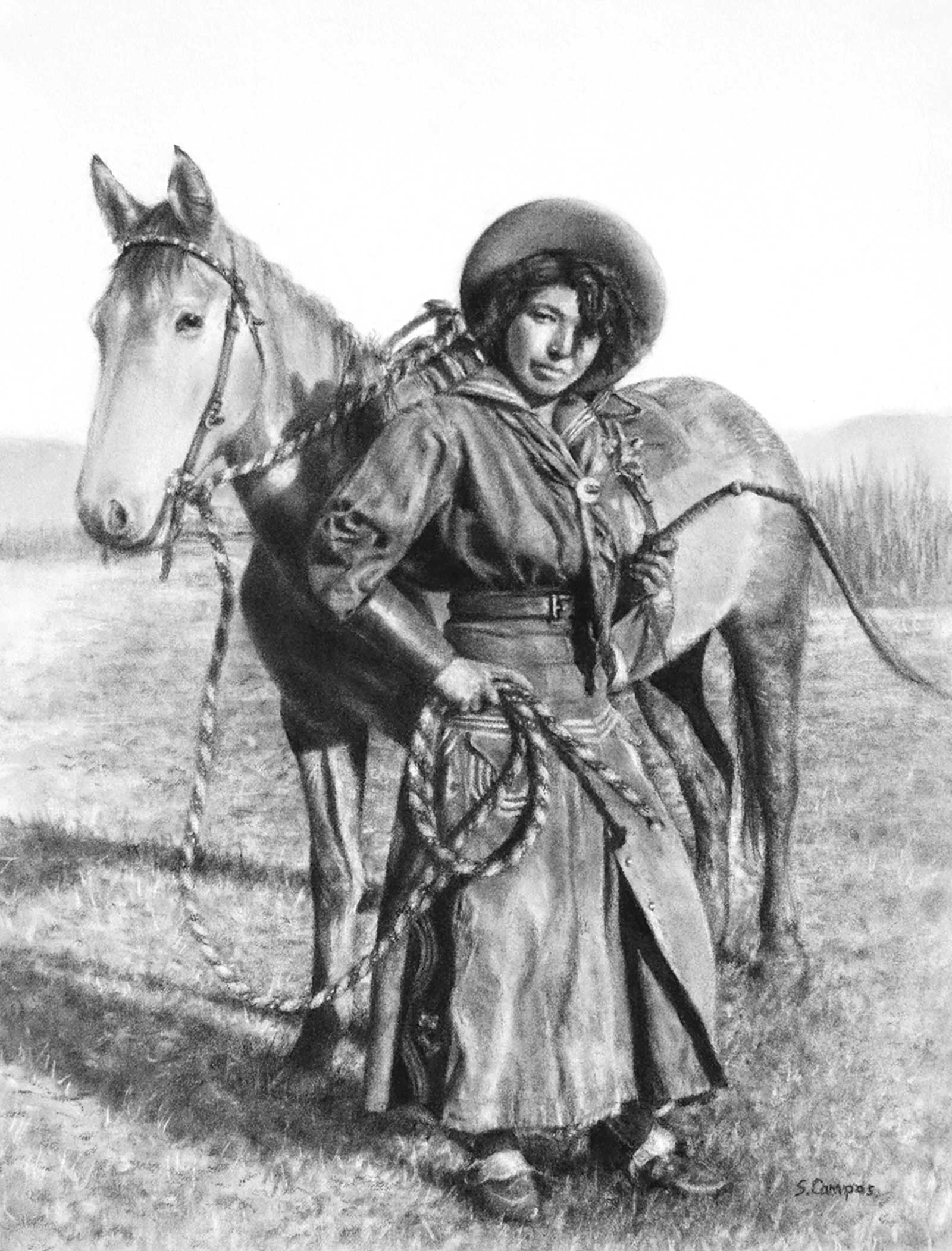 Artist Stephanie Campos recently completed her charcoal work Nellie Brown, who was an icon of the American West. “She used hand-braided reins called mecates(Spanish for horsehair rope),” Campos explains of her subject. “They were often a blend of black-and-white horse-tail hair and a traditional part of vaquero culture in the 18th and 19th centuries. Mecates are tied into the headstall and serve as both a rein and a lead rope.”