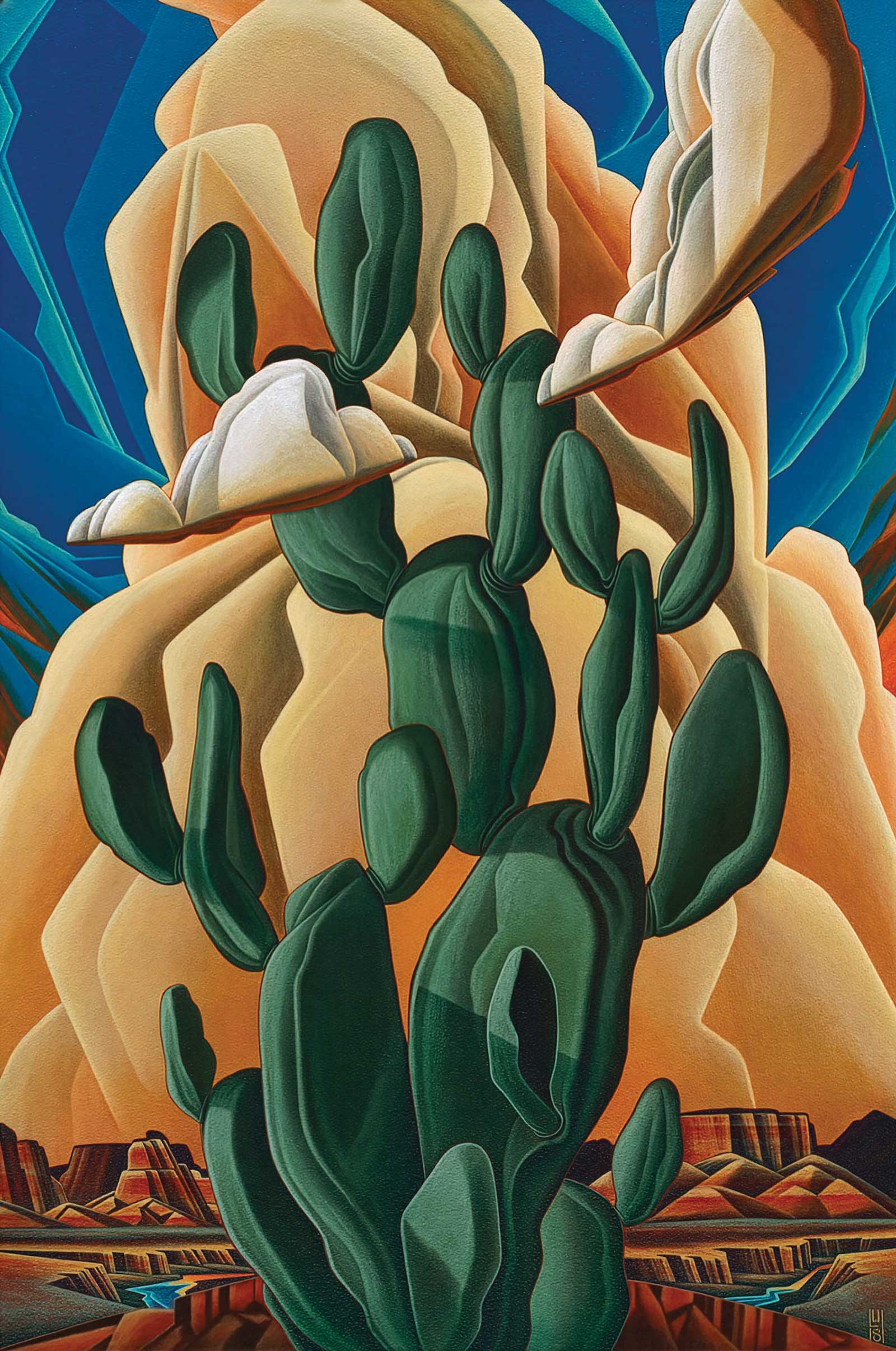 “My goal in creating Ascension of the Desert Soul is to have the painting evoke the sense of a spirit rising through the vast, sun-sculpted landscape of the Southwest. The cactus stretches upward like a living conduit between earth and sky, its forms both grounded and transcendent. Warm stone hues and cool, crystalline blues converge to suggest inner awakening—an emergence of resilience, memory and quiet power rising from the heart of the desert,” Haskell says. “I have always been drawn to the desert, even as a child, before seeing it in person I was intrigued and inspired by the sparse beauty of it. After visiting I knew that it would be a place that I would spend the rest of my life absorbing, and the more time I spend in it the more I am drawn to the natural abstraction, the amazing quality of the light, and the stark simplicity. In the title of the painting, I have referred to the desert soul, which to me is the quiet, enduring spirit that awakens when one connects deeply with the raw, unadorned beauty of arid landscapes. It reflects the wisdom of open space, the resilience of life that thrives in harsh conditions, and the calm clarity found in stillness. To carry a desert soul is to feel attuned to the earth’s ancient patience—rooted, observant and transformed by the subtle, sacred dialogue between sand, stone, sky and silence.” —