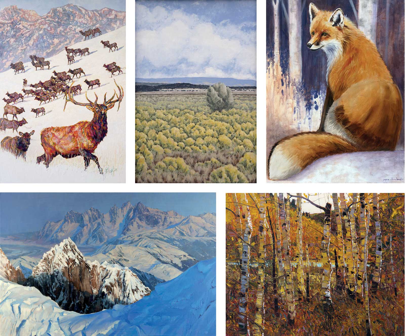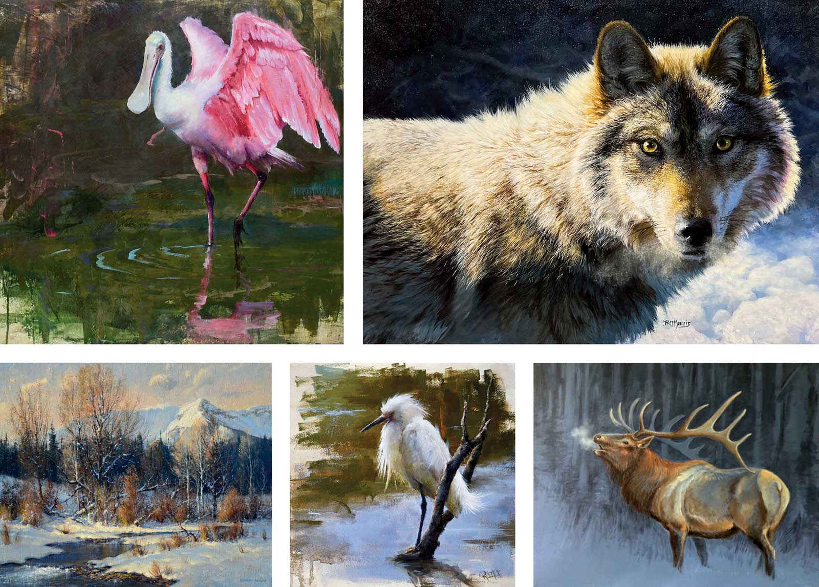 Top: Rana Jordahl, Wing It And See, oil, 24 x 24 in.; Legacy Gallery, A Frozen Moment, oil, 30 x 40 in., by Bonnie Marris. Bottom: Legacy Gallery, Remnants of the Season, oil, 20 x 24 in., by Robert Peters; Rana Jordahl, Egret Nothing, oil, 12 x 12 in.; Joyce Cleveland, Courting, oil on canvas, 16 x 20 in.
