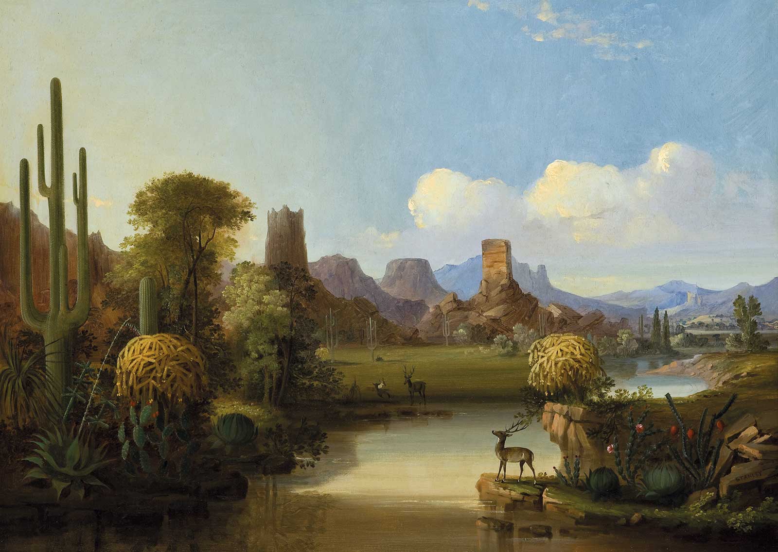Consider John Mix Stanley’s 1855 painting of Arizona, Chain of Spires Along the Gila River (Cadena de chapiteles a lo largo del río Gila). The painting skews slightly from the reality of Arizona: the landscape is rendered strangely, the cacti are almost otherworldly in their straightness and uniformity, and the placement of the plants in relation to water, land and animals is not accurate. Anyone who has been to Arizona would recognize the scene enough to place it in the Grand Canyon State, but they’d also know some rather large liberties were taken.