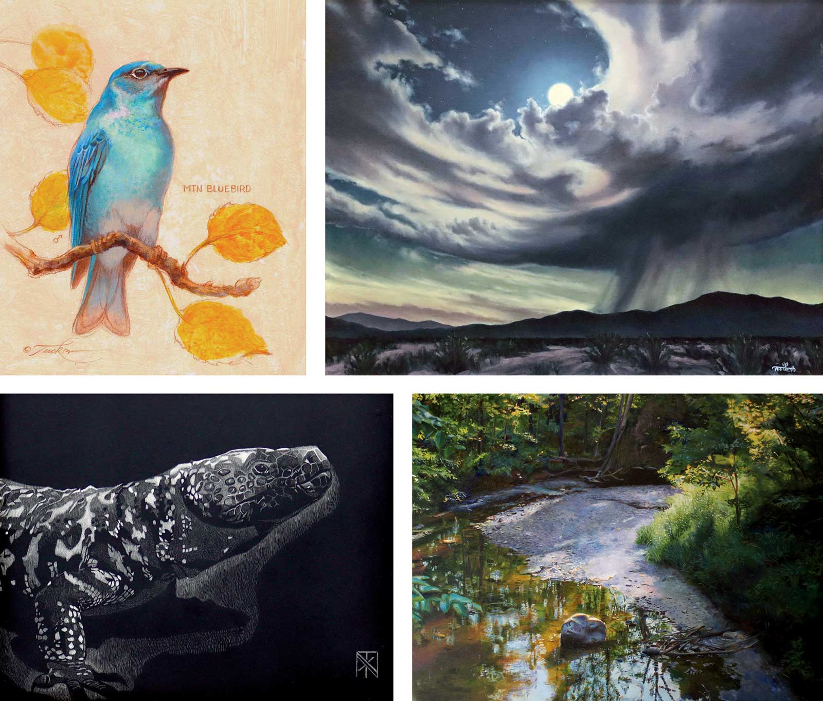 Top: Mark Sublette Medicine Man Gallery, Mountain Blue Bird, acrylic on illustration board, 10 x 8 in., by Ezra Tucker; Mark Sublette Medicine Man Gallery, Moon Storm, oil on linen panel, 30 x 40 in., by Whitney Gardner. Bottom: Mark Sublette Medicine Man Gallery, Galinda, scratchboard, 8 x 10 in., by Nelson Tucker; Dan Knepper, I Know Where the Stones Are, oil, 30 x 40 in.