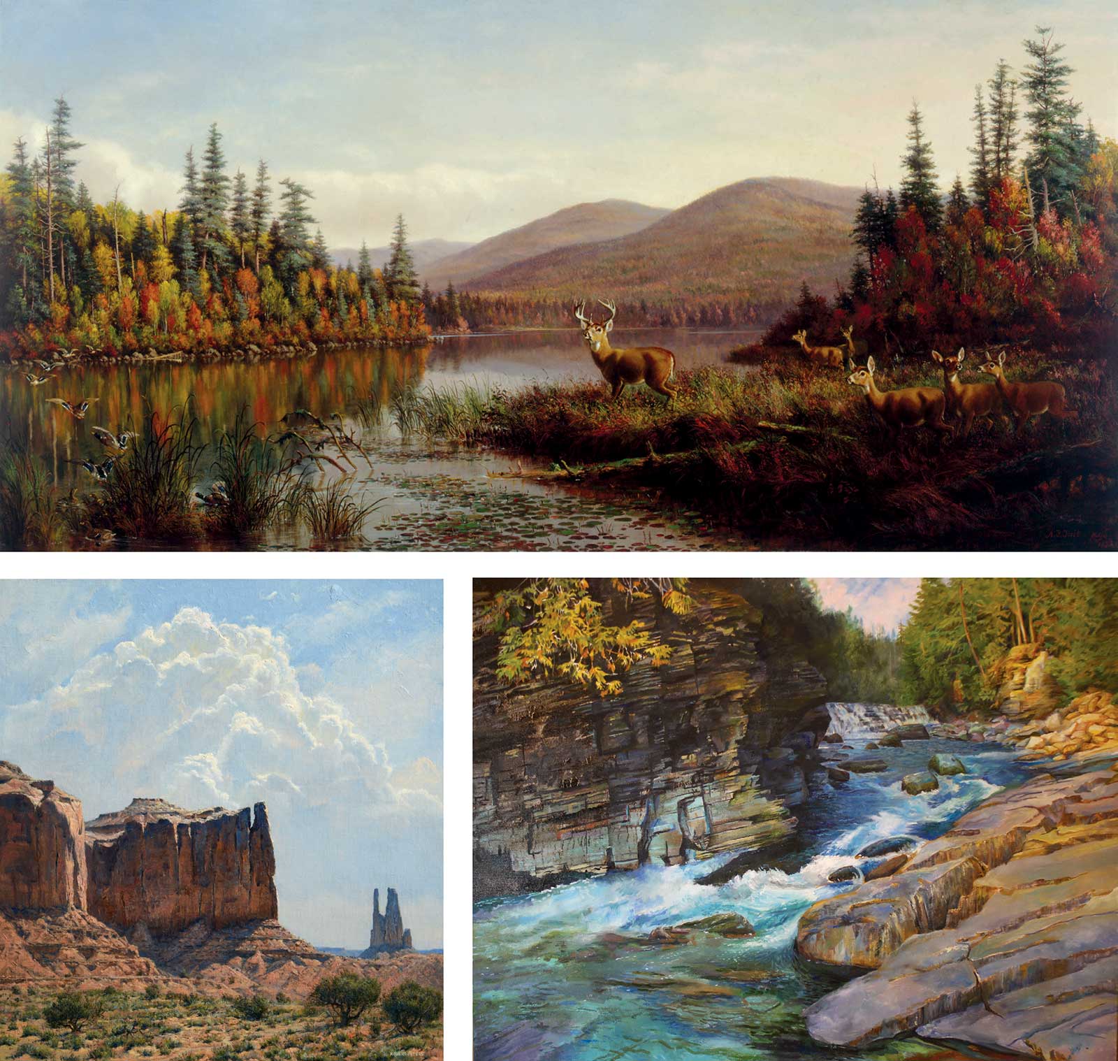Top: Arthur Fitzwilliam Tait (1819-1905), Autumn Morning, Racquette Lake, 1872, oil, 36 x 72 in. Bottom: Robert Peters, Navajo Skies, oil on linen, 30 x 28 in. Courtesy Legacy Gallery; Dan Knepper, Montana, Heart and Soul, oil, 30 x 40 in.