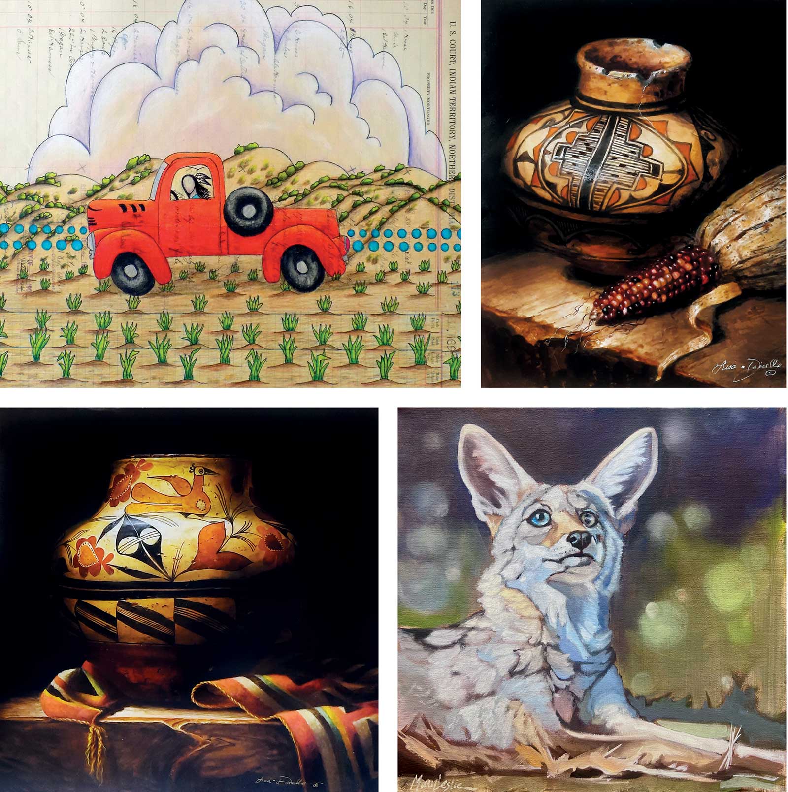Top: Dolores Purdy, Late for My Date, colored pencils on antique Indian Territory ledger paper, 13 x 15½ in. Lisa Danielle, Polychrome Pair-Hopi, acrylic, 10 x 8 in. Bottom: Lisa Danielle, Evolving Traditions, acrylic, 36 x 36 in. Mary Leslie Hartman, Baby Blue, oil on canvas, 16 x 16 in.
