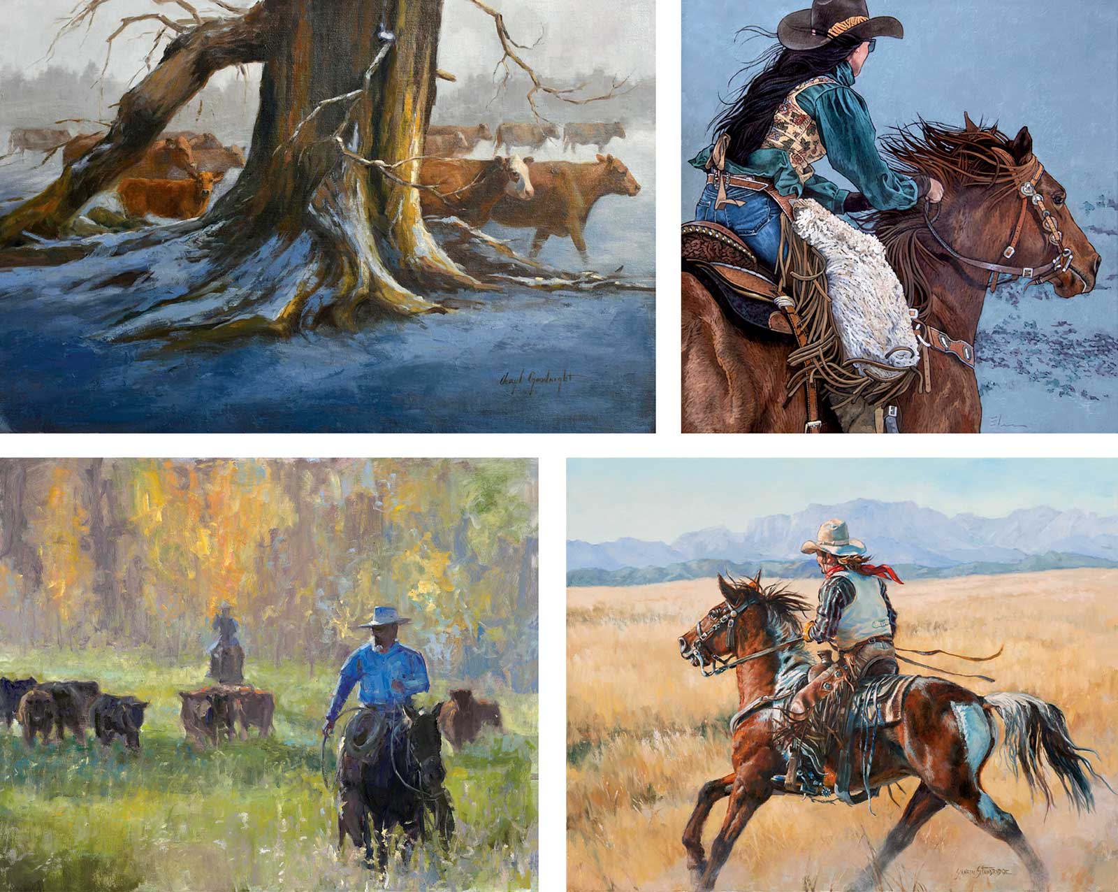 Top: Veryl Goodnight, Snow Showers, oil on linen, 20 x 30 in. Elise Mahaffie, She’s Got It, oil on canvas, 24 x 24 in. Bottom: Leah Lucas, Easy Riders, oil, 24 x 30 in. Sharon Standridge, Come a Running, oil on linen, 22 x 28 in.