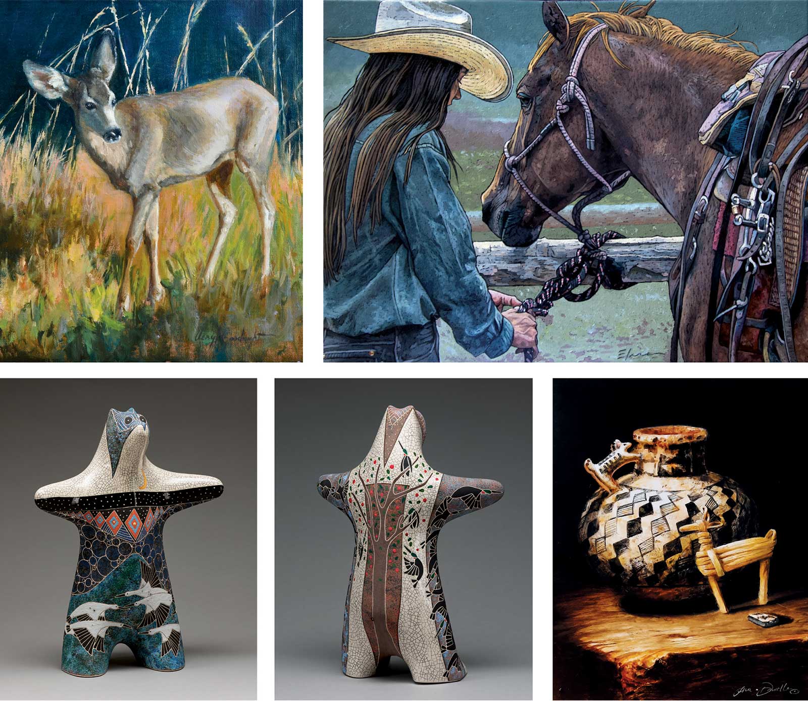 Top: Veryl Goodnight, Tranquility, oil on linen, 12 x 10 in. Elise Mahaffie, Days End, oil on canvas, 18 x 24 in. Bottom: Rebecca Tobey, Clouds Get in my Way, ceramic, 15 x 11 x 6 in. Rebecca Tobey, Just Before the Frost, ceramic, 14 x 19 x 4½ in. Lisa Danielle, Ancient Animals, acrylic, 10 x 8 in.