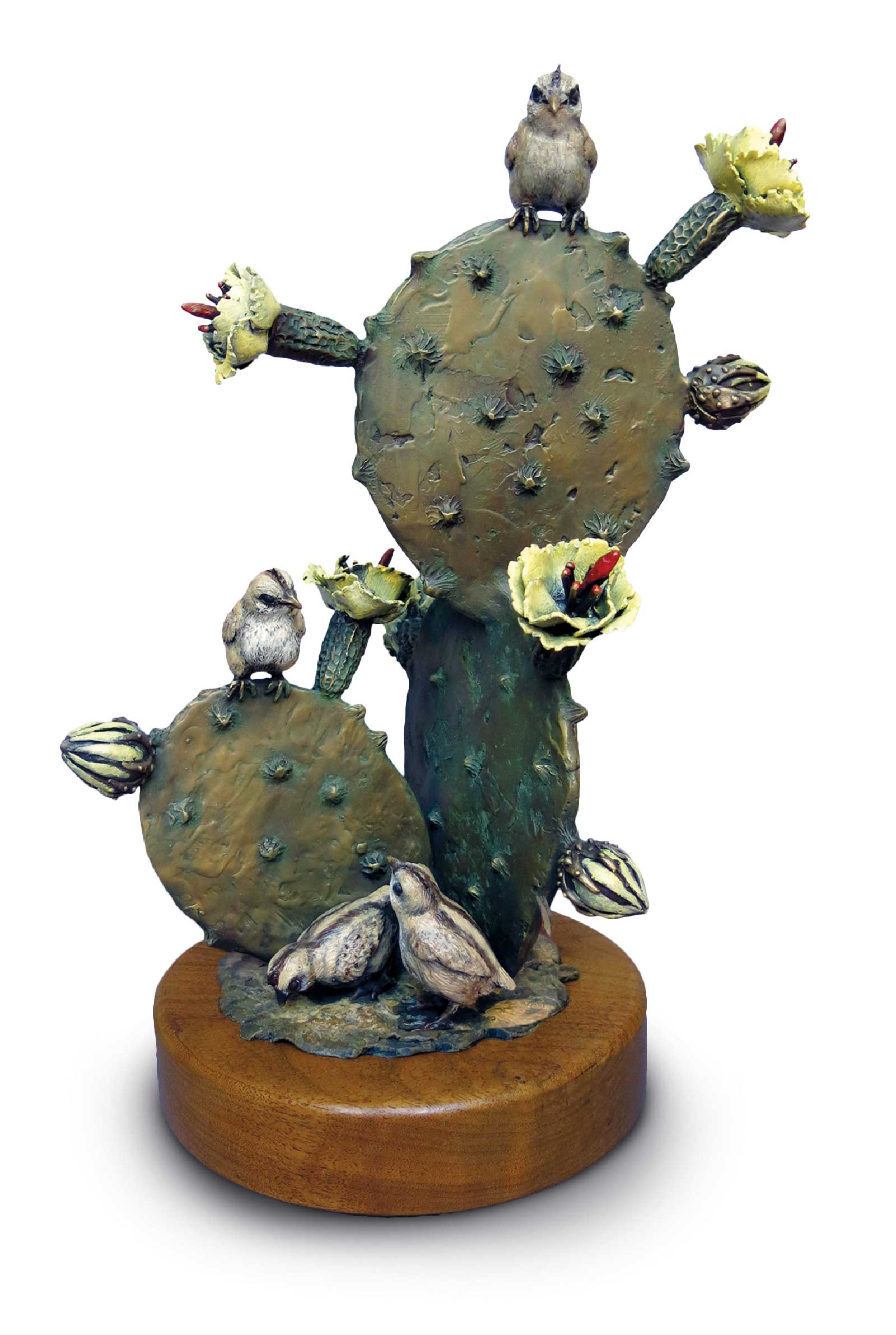 For her show piece June Bloom, a bronze sculpture depicting a quail and cactus, Deanne McKeown says, “Early June is the time when hatchings of Gambel’s quail appear and many cacti bloom in the desert. I love seeing a dozen of these new babies trailing one parent while another keeps watch nearby. Since quail and blossoms appear at the same time, I thought it apropos to have them ‘bloom’ together in my sculpture.”