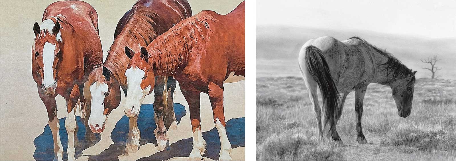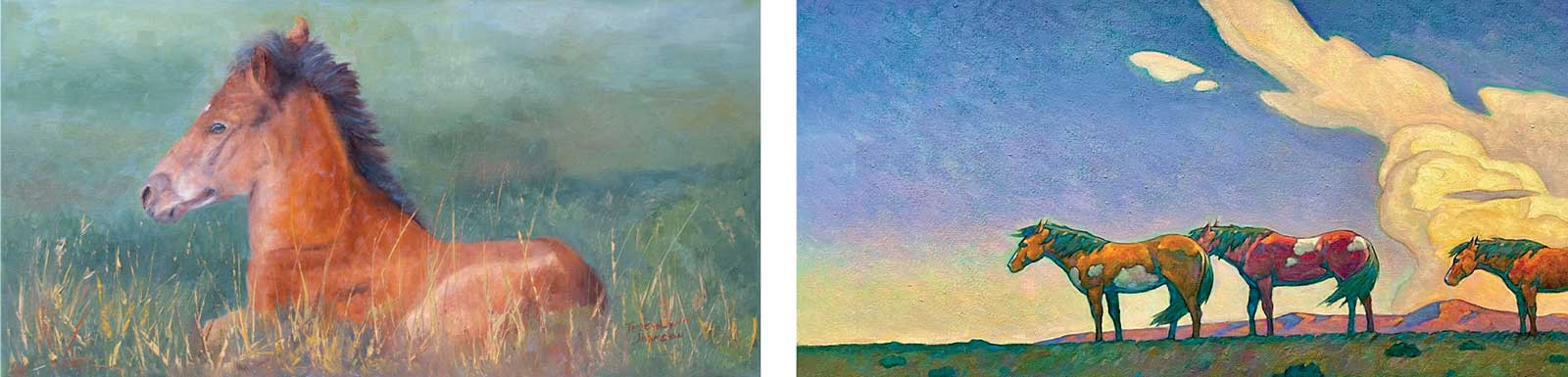 Teresa Lynn Johnson, Babe, oil on canvas, 12 x 24 in. Maxwell Alexander Gallery, Three Mustangs, oil, 18 x 36 in., by Howard Post.
