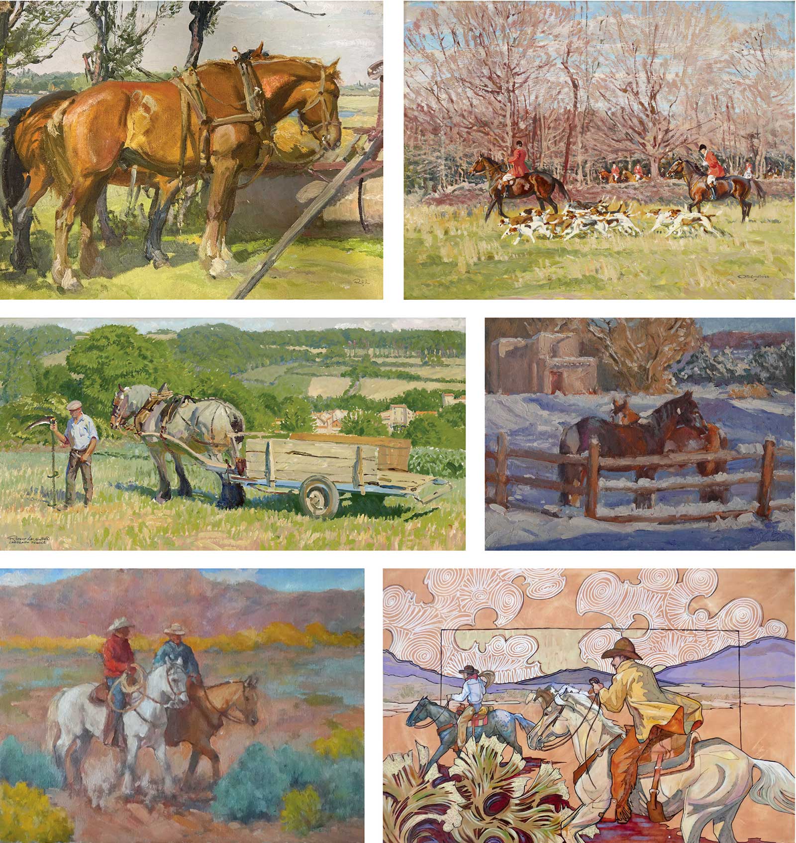 Top: Claggett/Rey Gallery, Portrait of a Team Partner, oil, 12 x 16 in., by Robert Lougheed (1910-1982). Claggett/Rey Gallery, Fairfield Hounds, oil, 20 x 26 in., by Robert Lougheed (1910-1982). Center: Claggett/Rey Gallery, Louis & Tintin in Chadrat, France, oil, 12 x 24 in., by Robert Lougheed (1910-1982). Cheryl Koen, Dreaming of a White Christmas, oil on canvas, 12 x 16 in. Bottom: Cheryl Koen, Compadres, oil on linen, oil on linen, 18 x 24 in. Maia Chavez Larkin, Riders in the Sage, oil and ink on canvas, 24 x 36 in.