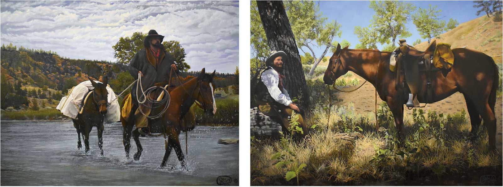 Jim E. Miller, Study - Retired From Rodeo, acrylic, 12 x 16 in.; Amber Rae Scally, Solitary Bliss, charcoal on panel, 16 x 20 in.