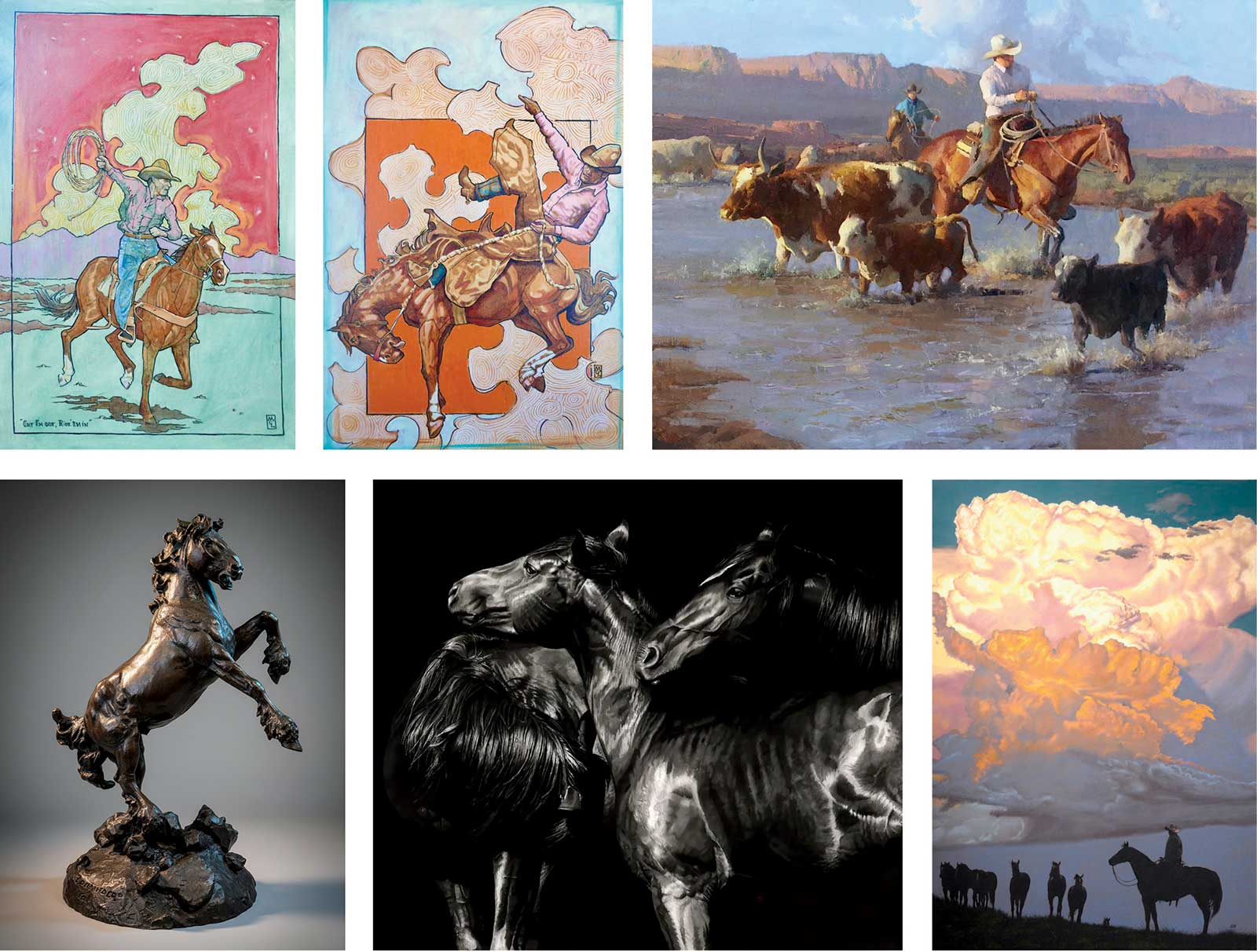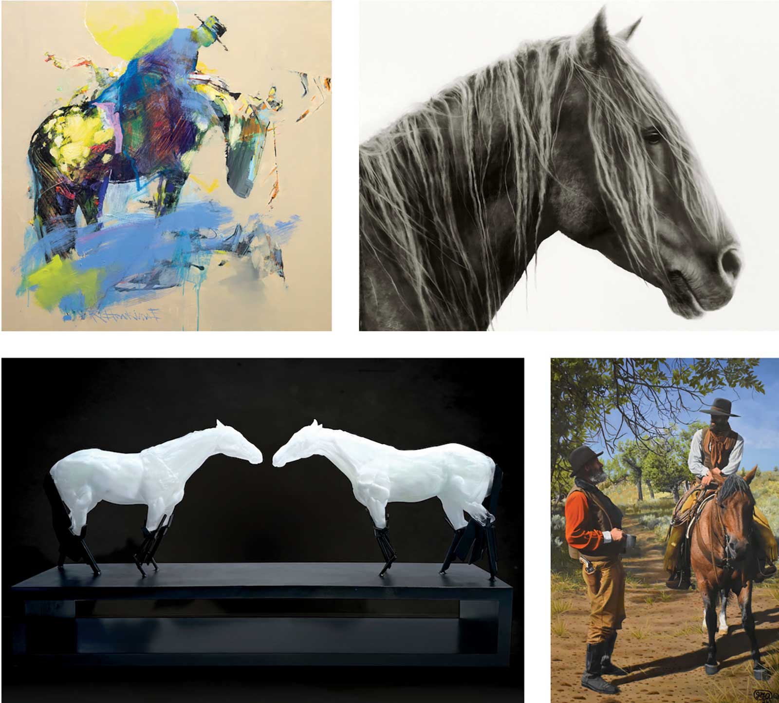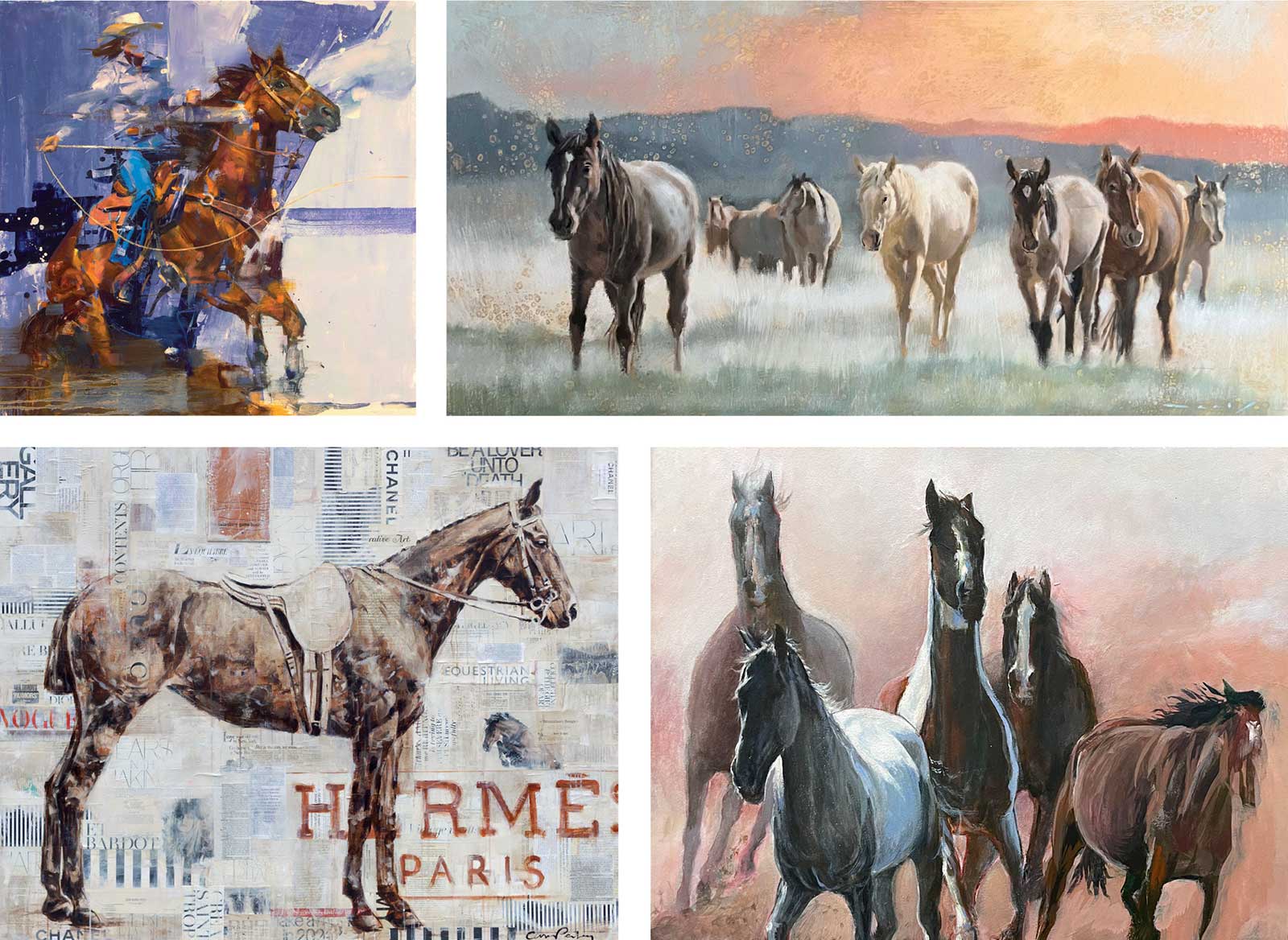 Top: Gallery Wild, Setting the Rope, mixed media, 30 x 30 in., by Julie T. Chapman; Gallery Wild, Pathfinders, oil on panel, 30 x 60 in., by Nealy Riley. Bottom: Gallery Wild, Years in the Making, mixed media on canvas, 48 x 60 in., by Carrie Penley; Jim E. Miller, WIP Alley Race, acrylic, 12 x 16 in.