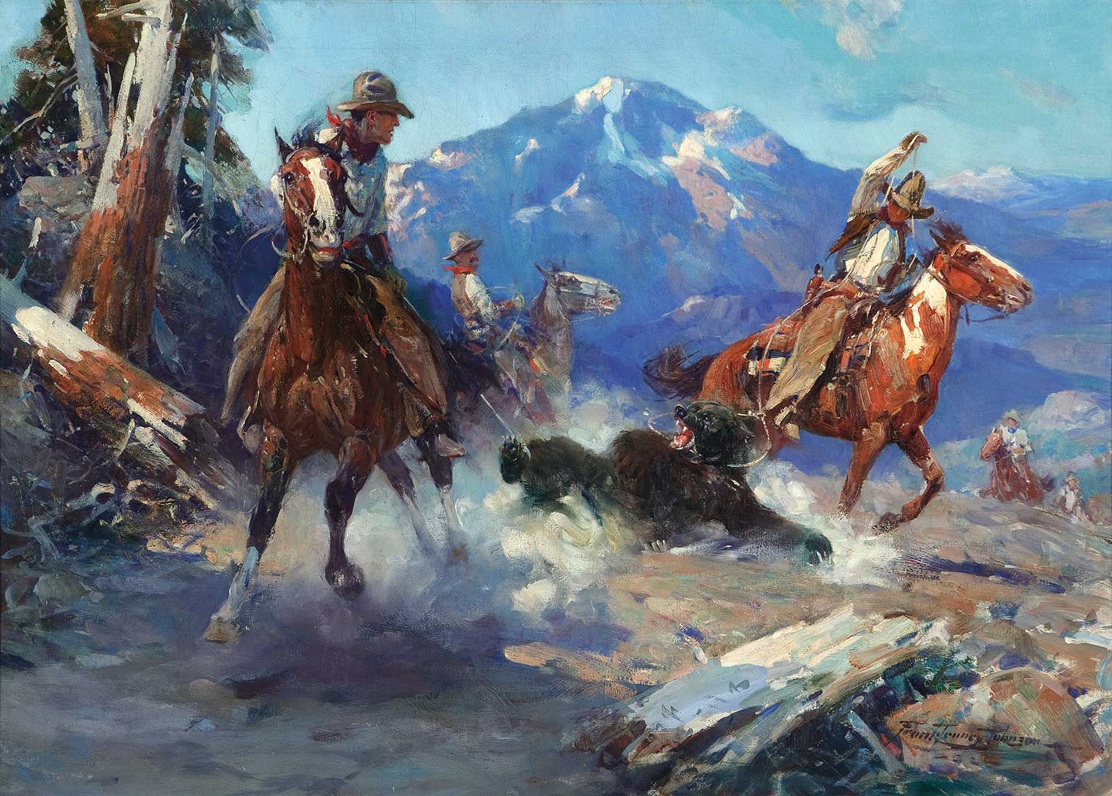 Frank Tenney Johnson (1874 - 1939), Cowboys Roping the Bear, oil on canvas laid on board, 26¼ x 36¼ inches