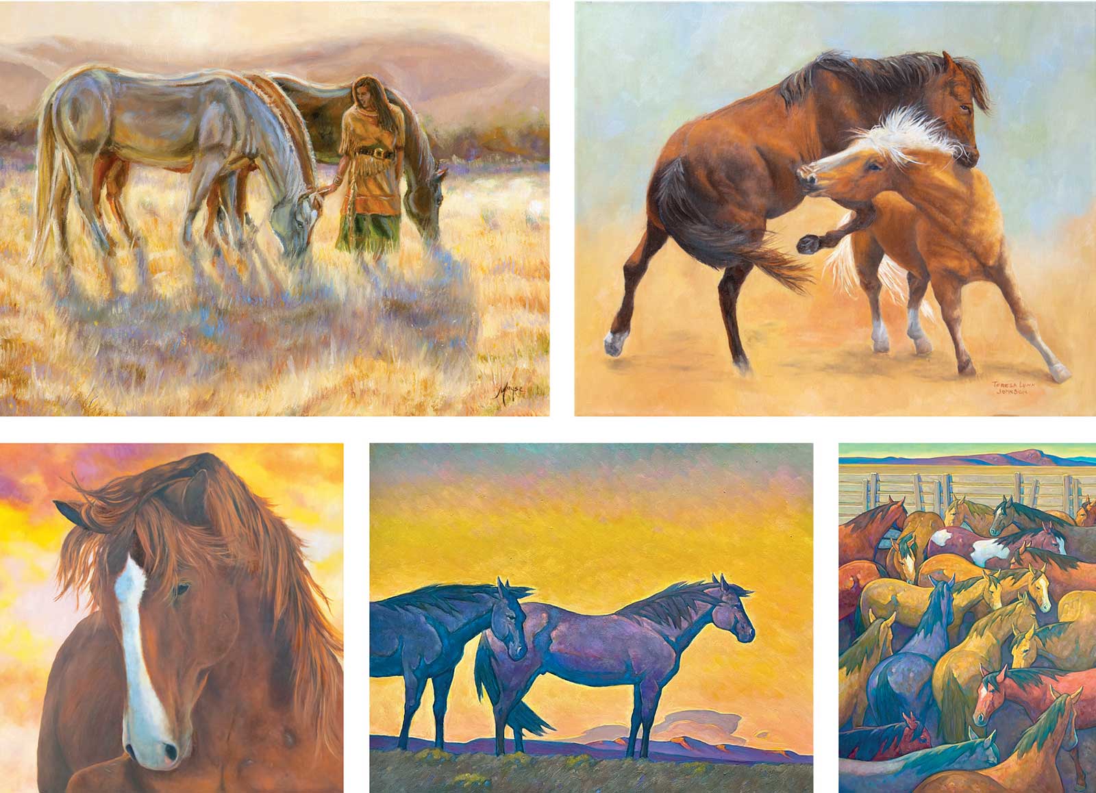Top: Gregory Mayse, Common Ground, oil on linen, 12 x 16 in. Teresa Lynn Johnson, Power Play, oil on linen, 16 x 20 in Bottom: Teresa Lynn Johnson, Wild and Free Come with Me, oil on canvas, 30 x 30 in. Maxwell Alexander Gallery, Hillside, oil, 24 x 30 in., by Howard Post. National Cowboy & Western Heritage Museum, The New Remuda, oil, 48 x 36 in., by Howard Post.