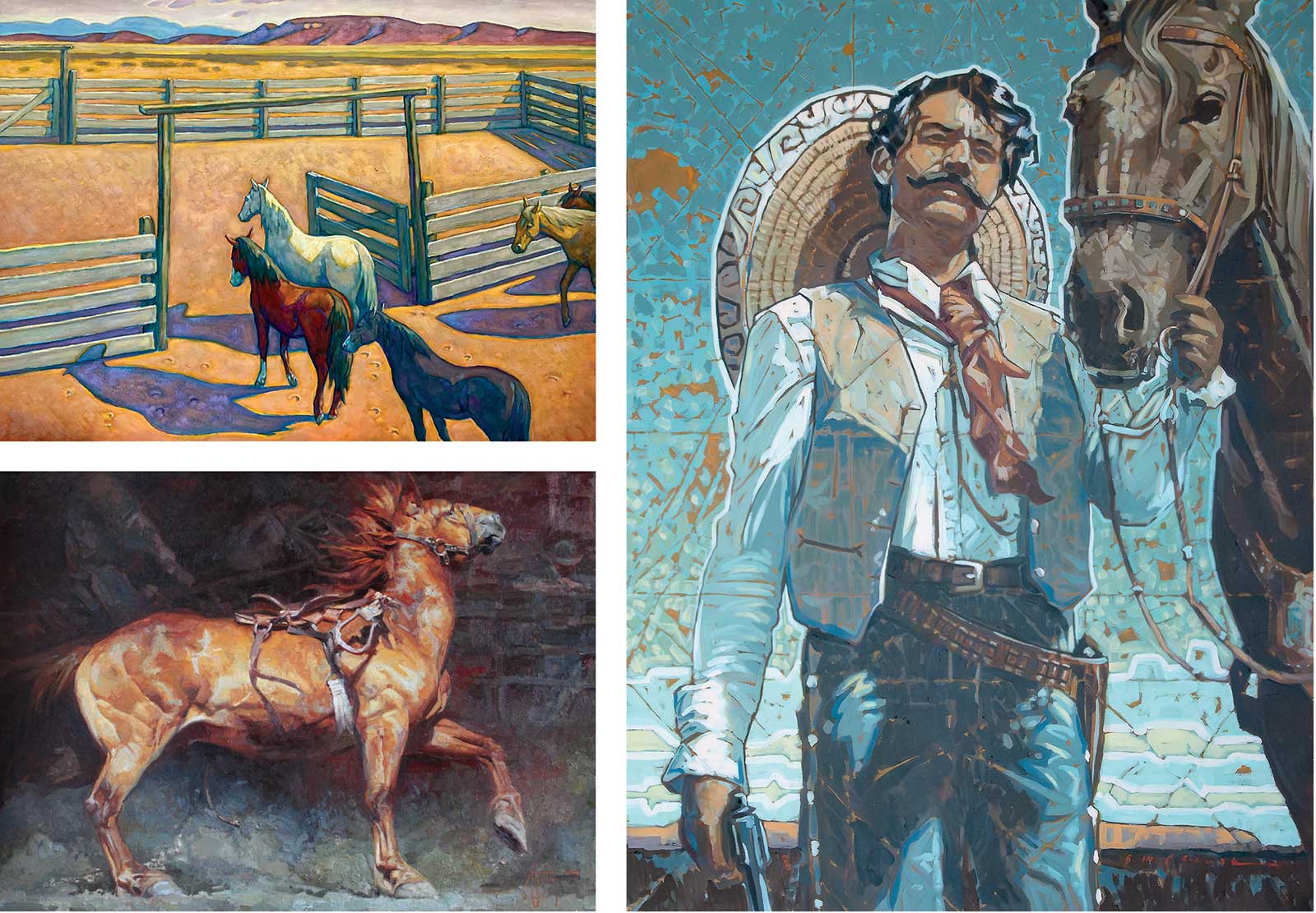 Clockwise from top left: Maxwell Alexander Gallery, Sortin’ the Mares, oil, 30 x 40 in., by Howard Post; National Cowboy & Western Heritage Museum, Crossdraw Trucha, oil on canvas, 40 x 30 in., by Sean Michael Chavez; National Cowboy & Western Heritage Museum, Full of Fight, oil on linen, 30 x 40 in., by Abigail Gutting.